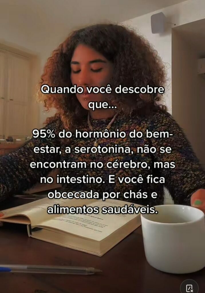 Foto de uma criadora de conteúdo do TikTok tomando chá para aumentar a serotonina.